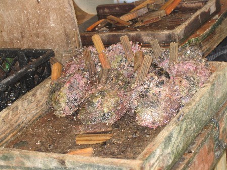 First the oysters are pried open and spacers are inserted